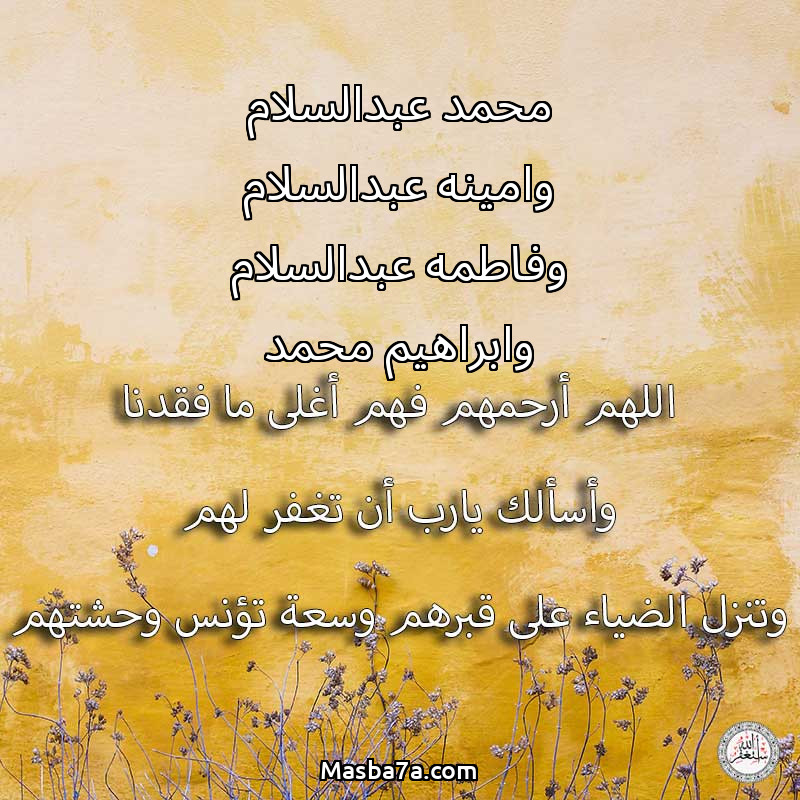اللهم ارحم ( محمد عبدالسلام وامينه عبدالسلام وفاطمه عبدالسلام وابراهيم محمد ) وانس وحشتهم واجمعنا بهم في جنتك ، اللهم ارحمهم بقدر شوقنا لهم اللهم ارحمهم واغفر لهم.