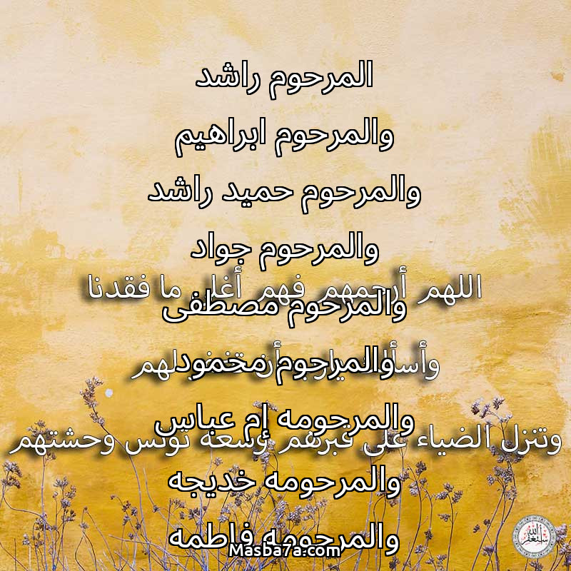 دعاء عن أرواح المرحومين المرحوم راشد والمرحوم ابراهيم والمرحوم حميد راشد والمرحوم جواد والمرحوم مصطفى والمرحوم محمود والمرحومه إم عباس والمرحومه خديجه والمرحومه فاطمه والمرحومه زينب