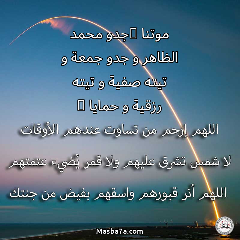 اللهم ارحم ( موتنا (جدو محمد الظاهر و جدو جمعة و تيته صفية و تيته رزقية و حمايا ) ) وانس وحشتهم واجمعنا بهم في جنتك ، اللهم ارحمهم بقدر شوقنا لهم اللهم ارحمهم واغفر لهم.
