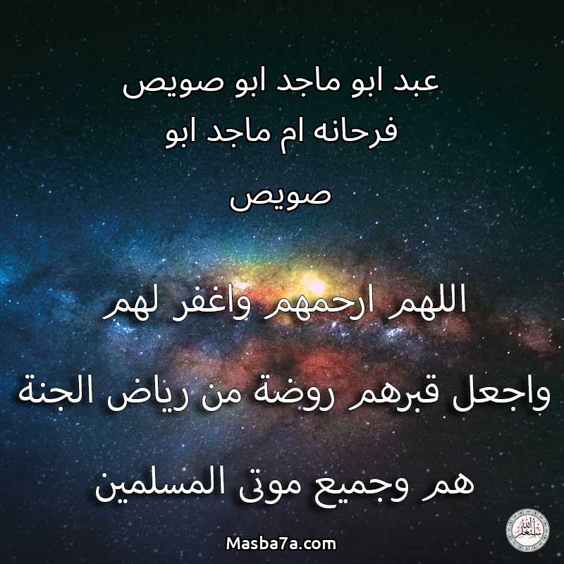 اللهم ارحم ( عبد ابو ماجد ابو صويص فرحانه ام ماجد ابو صويص ) وانس وحشتهم واجمعنا بهم في جنتك ، اللهم ارحمهم بقدر شوقنا لهم اللهم ارحمهم واغفر لهم.