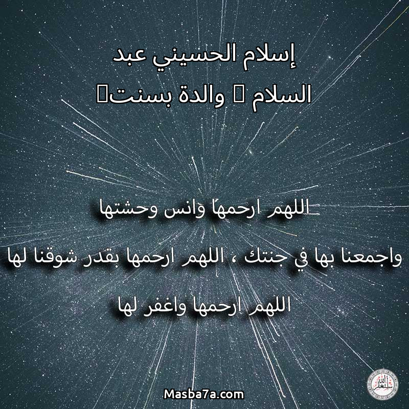 اللهم ارحم ( إسلام الحسيني عبد السلام ( والدة بسنت) ) وانس وحشتها واجمعنا بها في جنتك ، اللهم ارحمها بقدر شوقنا لها اللهم ارحمها واغفر لها .