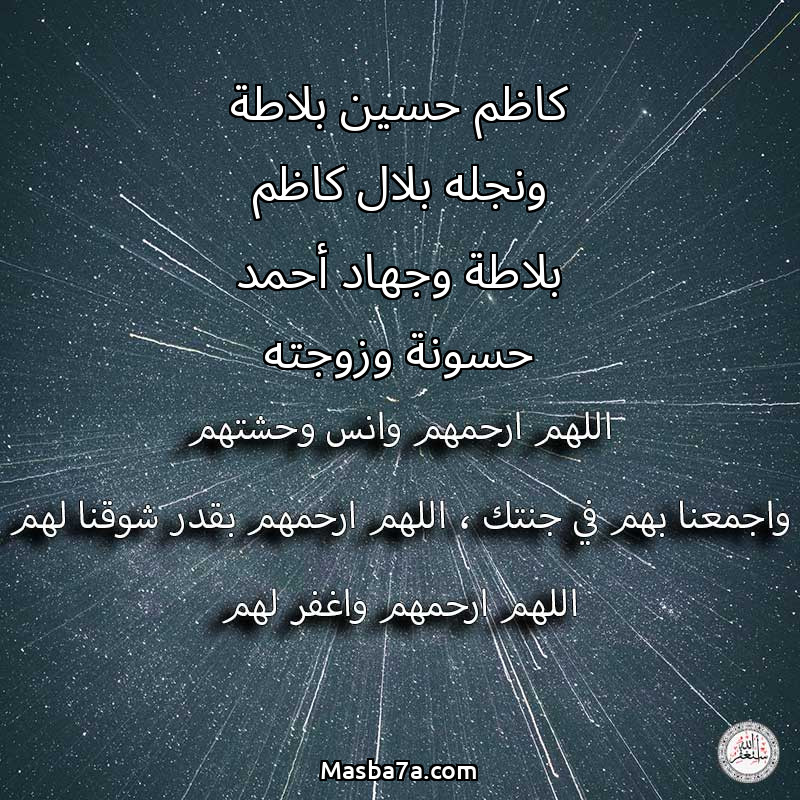 اللهم ارحم ( كاظم حسين بلاطة ونجله بلال كاظم بلاطة وجهاد أحمد حسونة وزوجته ) وانس وحشتهم واجمعنا بهم في جنتك ، اللهم ارحمهم بقدر شوقنا لهم اللهم ارحمهم واغفر لهم.