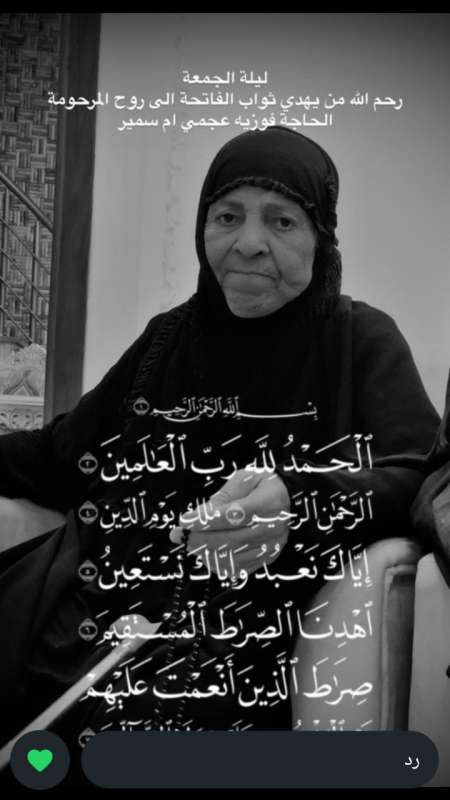 اللهم ارحم ( فوزيه عجمي ام سمير ) وانس وحشتها واجمعنا بها في جنتك ، اللهم ارحمها بقدر شوقنا لها اللهم ارحمها واغفر لها .