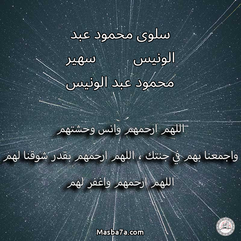 اللهم ارحم ( سلوى محمود عبد الونيس سهير محمود عبد الونيس ) وانس وحشتهم واجمعنا بهم في جنتك ، اللهم ارحمهم بقدر شوقنا لهم اللهم ارحمهم واغفر لهم.