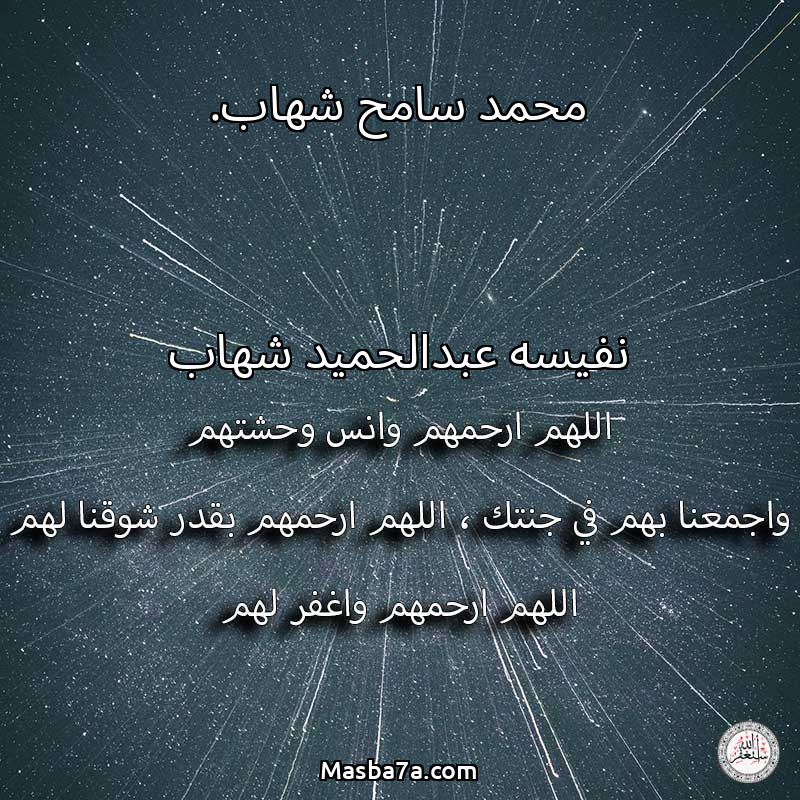 اللهم ارحم ( محمد سامح شهاب. نفيسه عبدالحميد شهاب ) وانس وحشتهم واجمعنا بهم في جنتك ، اللهم ارحمهم بقدر شوقنا لهم اللهم ارحمهم واغفر لهم.