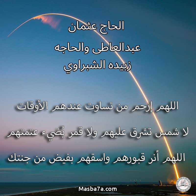 اللهم ارحم ( الحاج عثمان عبدالعاطى والحاجه زبيده الشبراوي ) وانس وحشتهم واجمعنا بهم في جنتك ، اللهم ارحمهم بقدر شوقنا لهم اللهم ارحمهم واغفر لهم.