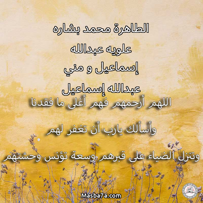 اللهم ارحم ( الطاهرة محمد بشاره علويه عبدالله إسماعيل و مني عبدالله إسماعيل ) وانس وحشتهم واجمعنا بهم في جنتك ، اللهم ارحمهم بقدر شوقنا لهم اللهم ارحمهم واغفر لهم.