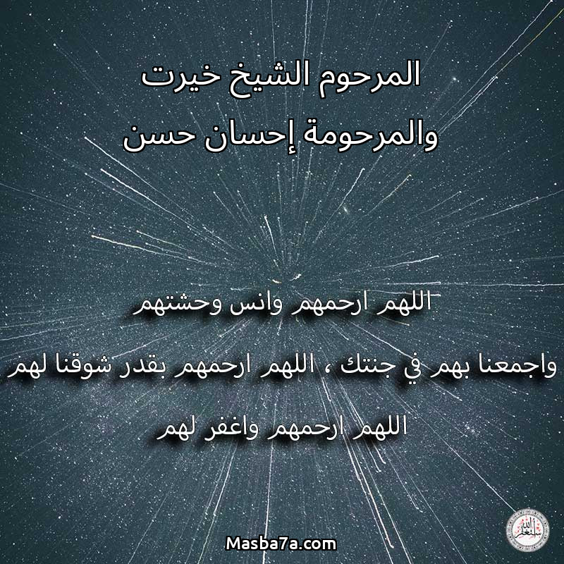 اللهم ارحم ( المرحوم الشيخ خيرت والمرحومة إحسان حسن ) وانس وحشتهم واجمعنا بهم في جنتك ، اللهم ارحمهم بقدر شوقنا لهم اللهم ارحمهم واغفر لهم.