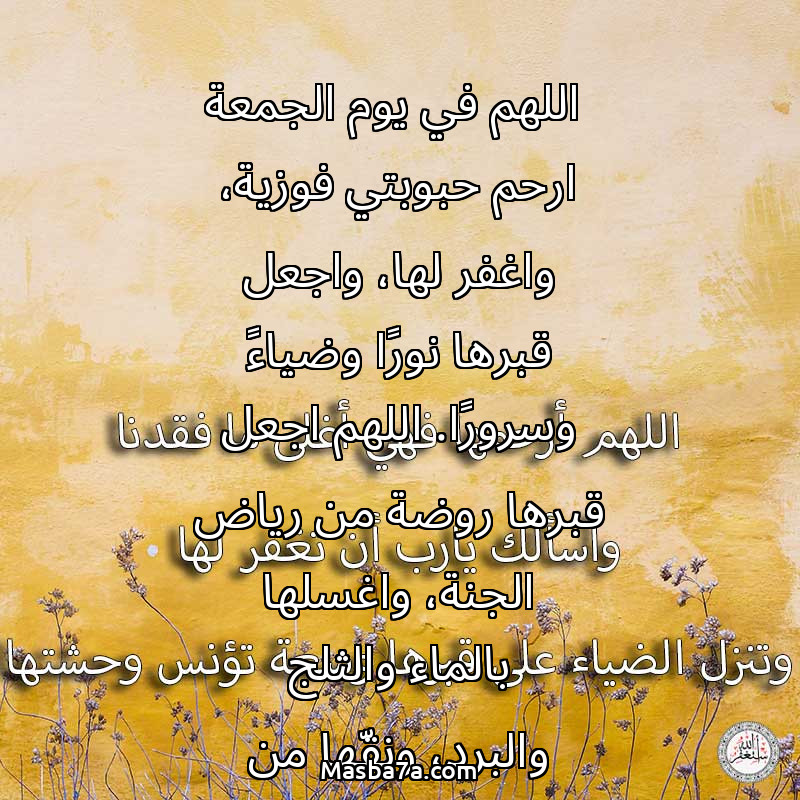 اللهم في يوم الجمعة ارحم حبوبتي فوزية، واغفر لها، واجعل قبرها نورًا وضياءً وسرورًا. اللهم اجعل قبرها روضة من رياض الجنة، واغسلها بالماء والثلج والبرد، ونقّها من الذنوب كما يُنقّى الثوب الأبيض من الدنس. اللهم آنس وحشتها، وارفع درجتها في الجنة، واجمعنا بها في جناتك يا رب. اللهم اجعل أعمالها الصالحة شفيعةً لها، وثقّل بها ميزان حسناتها. اللهم في هذا اليوم المبارك، اجعل دعاءنا لها نورًا يصل إليها، ورحمةً تغشاها، وسكينةً تملأ قبرها.