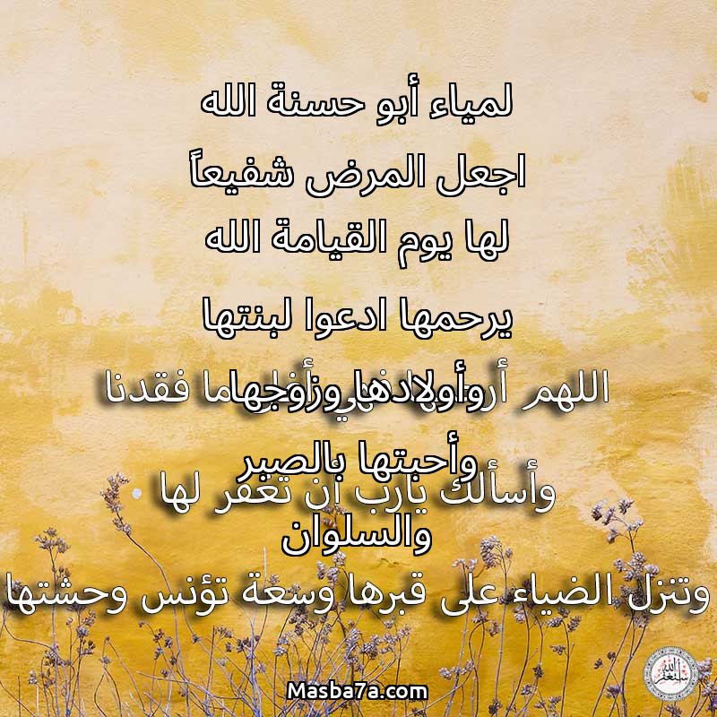 دعاء عن روح المرحومة لمياء أبو حسنة الله اجعل المرض شفيعاً لها يوم القيامة الله يرحمها ادعوا لبنتها وأولادها وزوجها وأحبتها بالصبر والسلوان