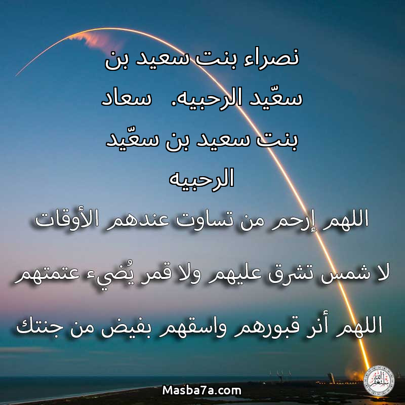 اللهم ارحم ( نصراء بنت سعيد بن سعّيد الرحبيه. سعاد بنت سعيد بن سعّيد الرحبيه ) وانس وحشتهم واجمعنا بهم في جنتك ، اللهم ارحمهم بقدر شوقنا لهم اللهم ارحمهم واغفر لهم.