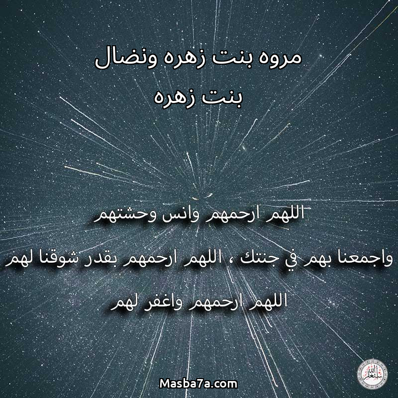 اللهم ارحم ( مروه بنت زهره ونضال بنت زهره ) وانس وحشتهم واجمعنا بهم في جنتك ، اللهم ارحمهم بقدر شوقنا لهم اللهم ارحمهم واغفر لهم.
