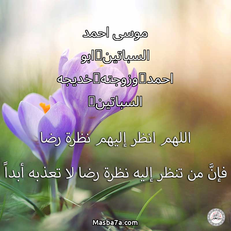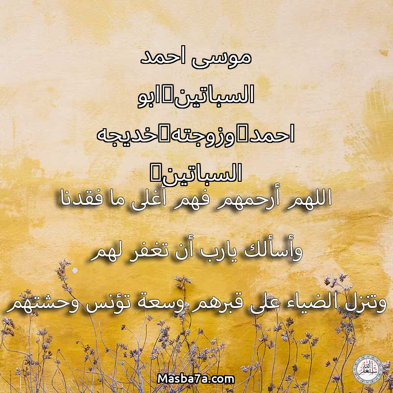 اللهم ارحم ( موسى احمد السباتين(ابو احمد)وزوجته(خديجه السباتين) ) وانس وحشتهم واجمعنا بهم في جنتك ، اللهم ارحمهم بقدر شوقنا لهم اللهم ارحمهم واغفر لهم.