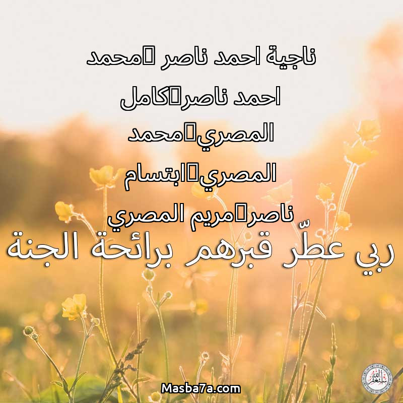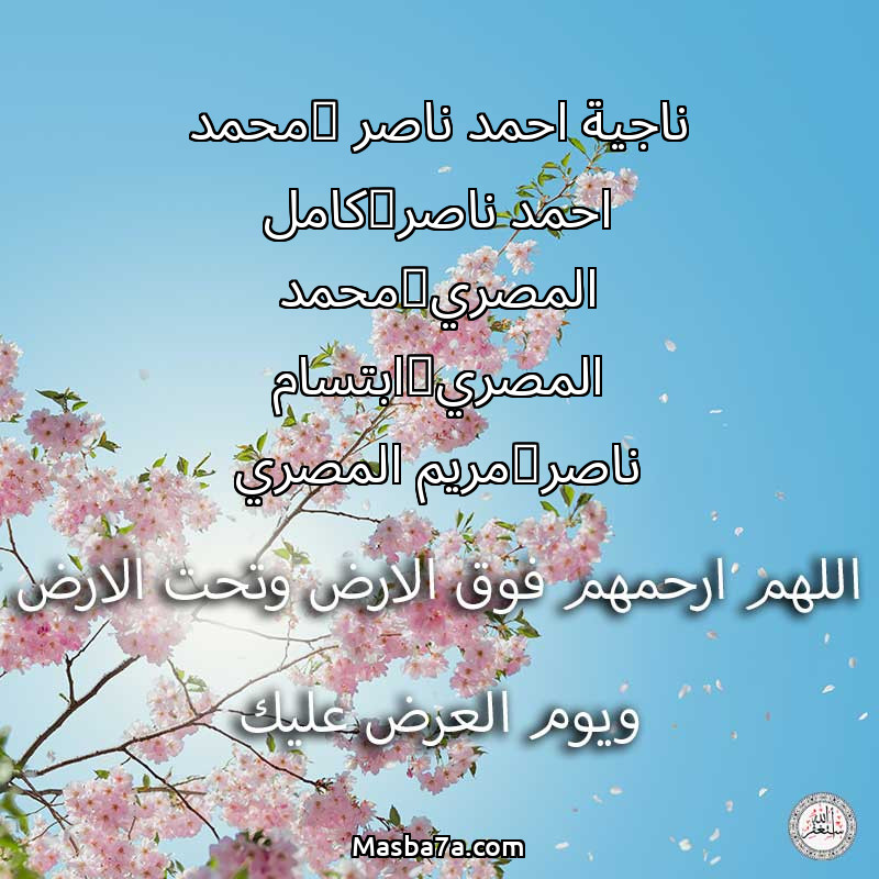 اللهم ارحم ( ناجية احمد ناصر @محمد احمد ناصر@كامل المصري@محمد المصري@ابتسام ناصر@مريم المصري ) وانس وحشتهم واجمعنا بهم في جنتك ، اللهم ارحمهم بقدر شوقنا لهم اللهم ارحمهم واغفر لهم.