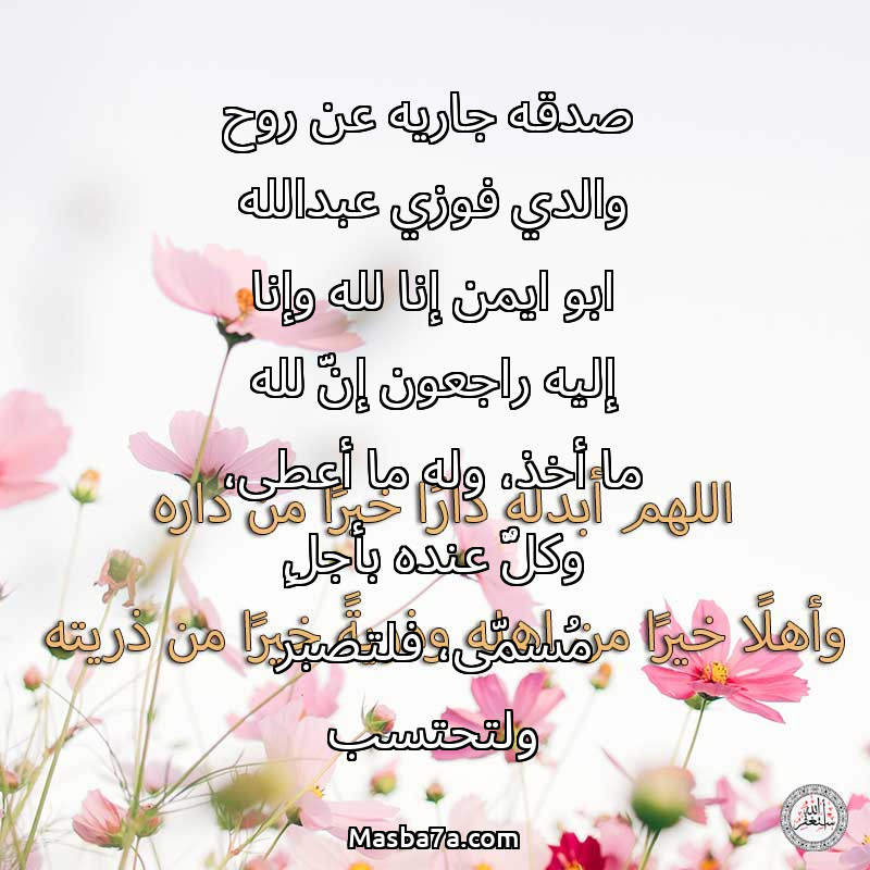 دعاء عن روح المرحوم صدقه جاريه عن روح والدي فوزي عبدالله ابو ايمن إنا لله وإنا إليه راجعون إنَّ لله ما أخذ، وله ما أعطى، وكلٌّ عنده بأجلٍ مُسمّى، فلتصبر ولتحتسب