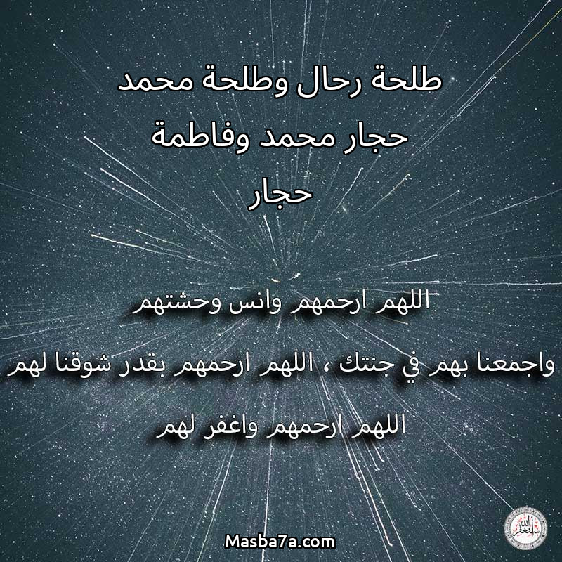 اللهم ارحم ( طلحة رحال وطلحة محمد حجار محمد وفاطمة حجار ) وانس وحشتهم واجمعنا بهم في جنتك ، اللهم ارحمهم بقدر شوقنا لهم اللهم ارحمهم واغفر لهم.
