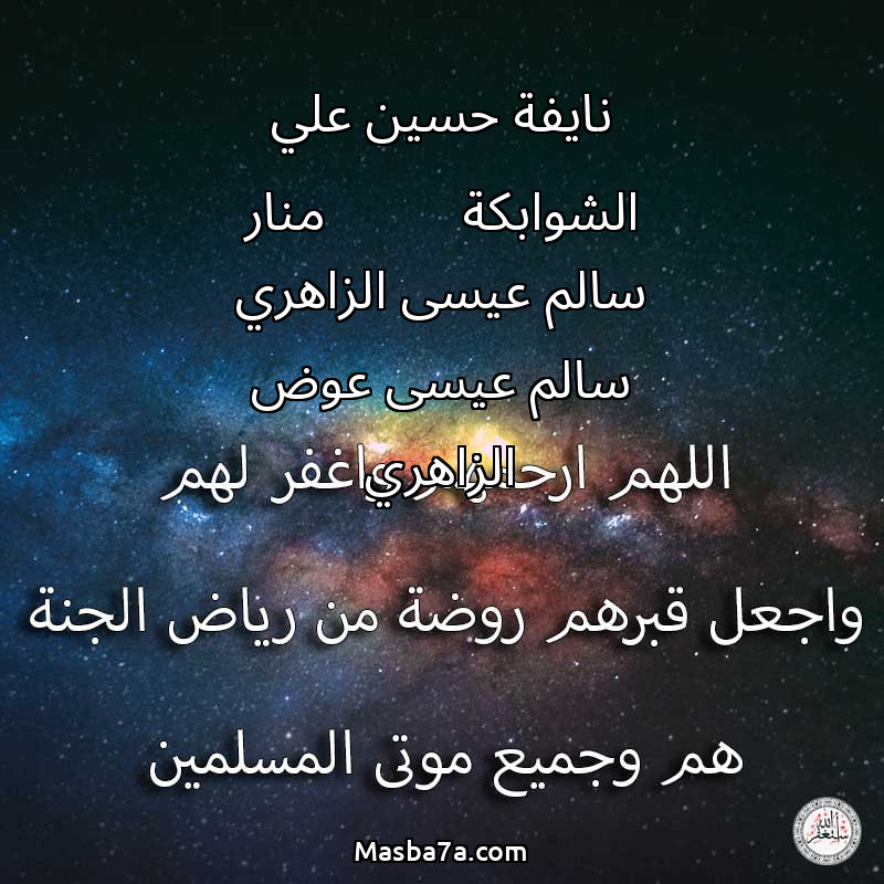 اللهم ارحم ( نايفة حسين علي الشوابكة منار سالم عيسى الزاهري سالم عيسى عوض الزاهري ) وانس وحشتهم واجمعنا بهم في جنتك ، اللهم ارحمهم بقدر شوقنا لهم اللهم ارحمهم واغفر لهم.