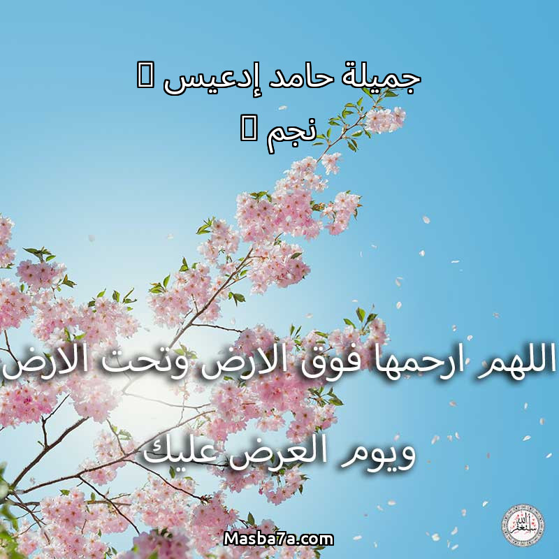اللهم ارحم ( جميلة حامد إدعيس ( نجم ) ) وانس وحشتها واجمعنا بها في جنتك ، اللهم ارحمها بقدر شوقنا لها اللهم ارحمها واغفر لها .