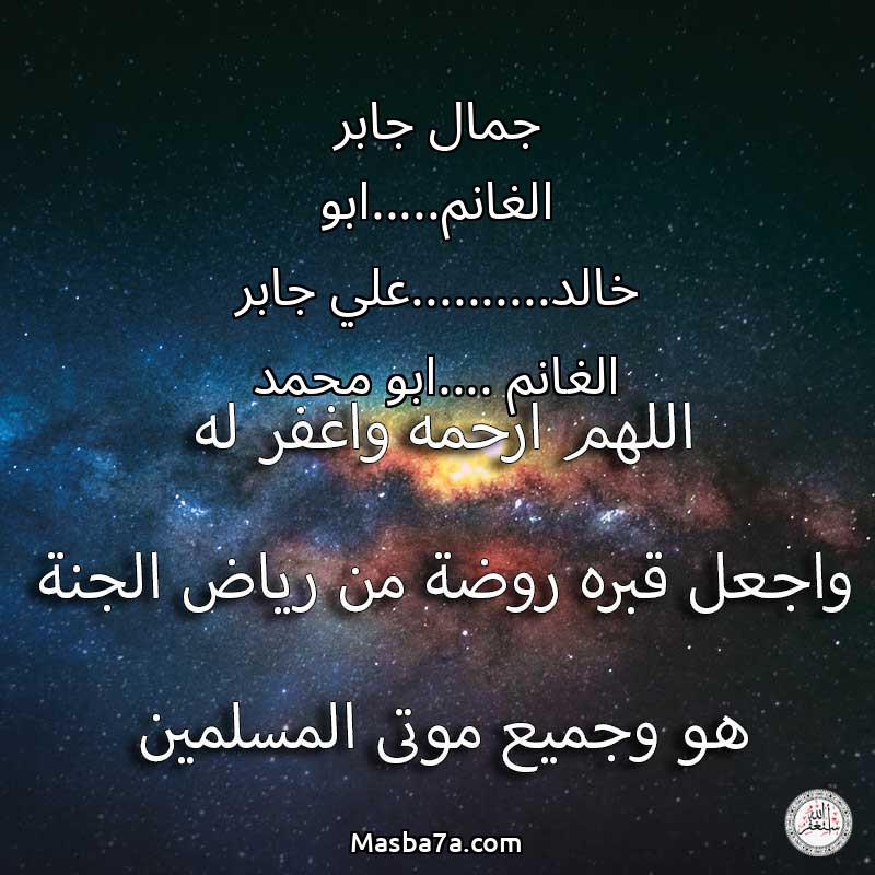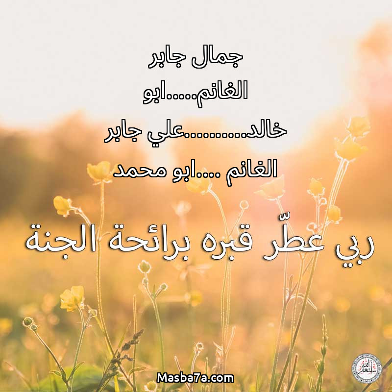 اللهم ارحم ( جمال جابر الغانم.....ابو خالد..........علي جابر الغانم ....ابو محمد ) وانس وحشته واجمعنا به في جنتك ، اللهم ارحمه بقدر شوقنا له اللهم ارحمه واغفر له .