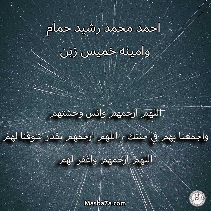 اللهم ارحم ( احمد محمد رشيد حمام وامينه خميس زبن ) وانس وحشتهم واجمعنا بهم في جنتك ، اللهم ارحمهم بقدر شوقنا لهم اللهم ارحمهم واغفر لهم.