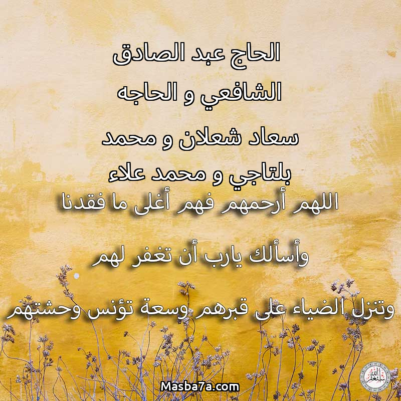اللهم ارحم ( الحاج عبد الصادق الشافعي و الحاجه سعاد شعلان و محمد بلتاجي و محمد علاء ) وانس وحشتهم واجمعنا بهم في جنتك ، اللهم ارحمهم بقدر شوقنا لهم اللهم ارحمهم واغفر لهم.