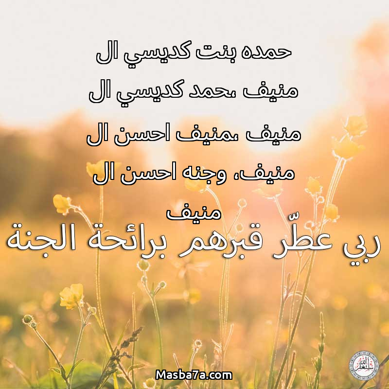 اللهم ارحم ( حمده بنت كديسي ال منيف ،حمد كديسي ال منيف ،منيف احسن ال منيف، وجنه احسن ال منيف ) وانس وحشتهم واجمعنا بهم في جنتك ، اللهم ارحمهم بقدر شوقنا لهم اللهم ارحمهم واغفر لهم.