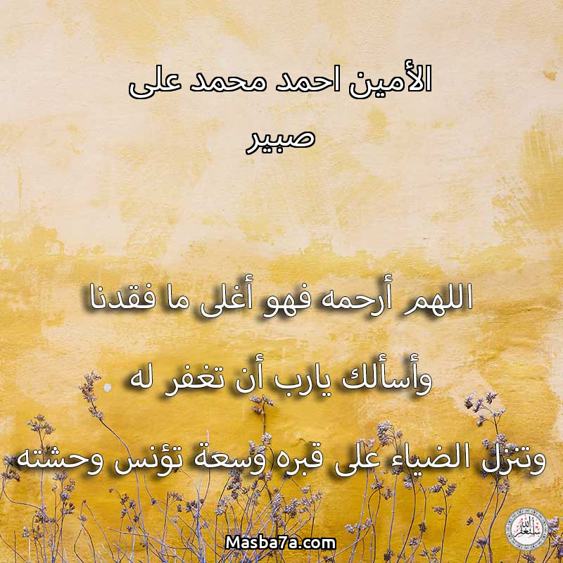 اللهم ارحم ( الأمين احمد محمد على صبير ) وانس وحشته واجمعنا به في جنتك ، اللهم ارحمه بقدر شوقنا له اللهم ارحمه واغفر له .
