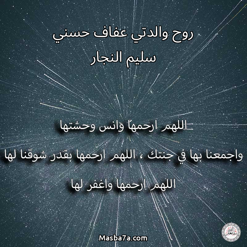 اللهم ارحم ( روح والدتي عفاف حسني سليم النجار ) وانس وحشتها واجمعنا بها في جنتك ، اللهم ارحمها بقدر شوقنا لها اللهم ارحمها واغفر لها .