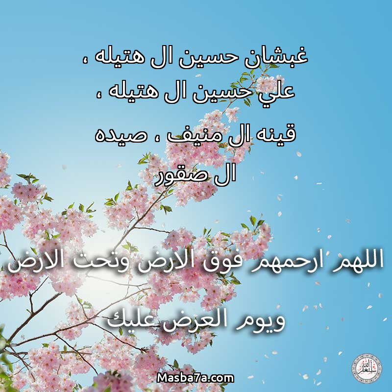 اللهم ارحم ( غبشان حسين ال هتيله ، علي حسين ال هتيله ، قينه ال منيف ، صيده ال صقور ) وانس وحشتهم واجمعنا بهم في جنتك ، اللهم ارحمهم بقدر شوقنا لهم اللهم ارحمهم واغفر لهم.