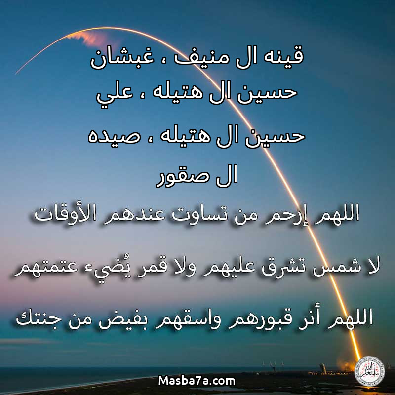 اللهم ارحم ( قينه ال منيف ، غبشان حسين ال هتيله ، علي حسين ال هتيله ، صيده ال صقور ) وانس وحشته واجمعنا به في جنتك ، اللهم ارحمه بقدر شوقنا له اللهم ارحمه واغفر له .
