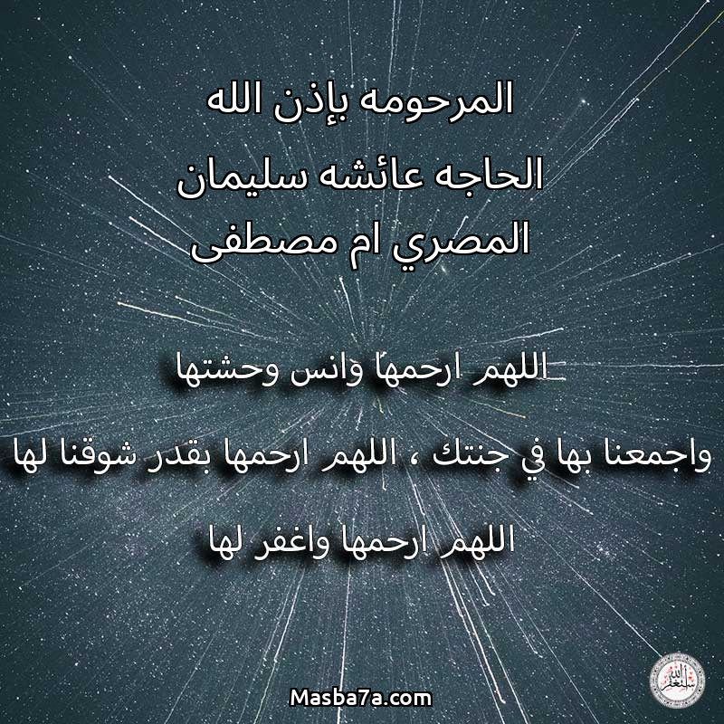 اللهم ارحم ( المرحومه بإذن الله الحاجه عائشه سليمان المصري ام مصطفى ) وانس وحشتها واجمعنا بها في جنتك ، اللهم ارحمها بقدر شوقنا لها اللهم ارحمها واغفر لها .