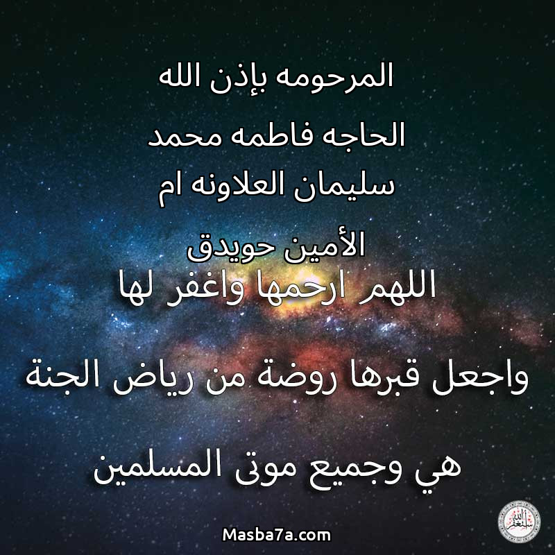 اللهم ارحم ( المرحومه بإذن الله الحاجه فاطمه محمد سليمان العلاونه ام الأمين حويدق ) وانس وحشتها واجمعنا بها في جنتك ، اللهم ارحمها بقدر شوقنا لها اللهم ارحمها واغفر لها .