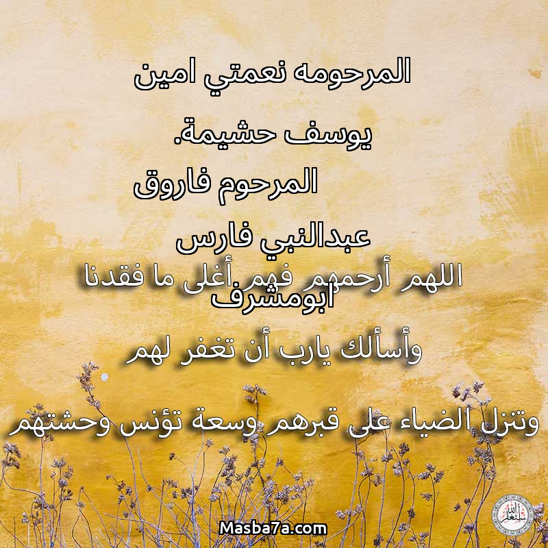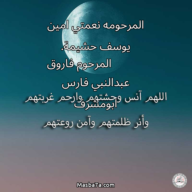 اللهم ارحم ( المرحومه نعمتي امين يوسف حشيمة. المرحوم فاروق عبدالنبي فارس ابومشرف ) وانس وحشتهم واجمعنا بهم في جنتك ، اللهم ارحمهم بقدر شوقنا لهم اللهم ارحمهم واغفر لهم.