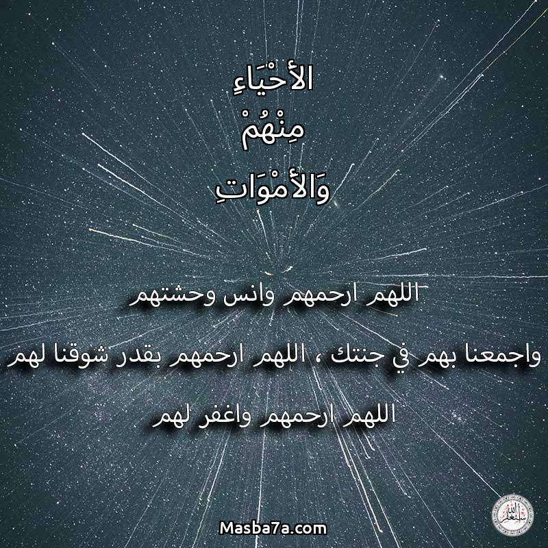 اللهم ارحم ( الأَحْيَاءِ مِنْهُمْ وَالأَمْوَاتِ ) وانس وحشتهم واجمعنا بهم في جنتك ، اللهم ارحمهم بقدر شوقنا لهم اللهم ارحمهم واغفر لهم.