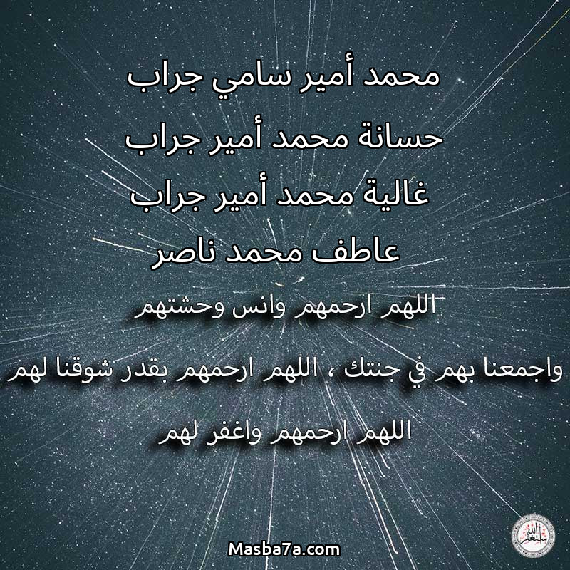 اللهم ارحم ( محمد أمير سامي جراب - حسانة محمد أمير جراب - غالية محمد أمير جراب - عاطف محمد ناصر ) وانس وحشتهم واجمعنا بهم في جنتك ، اللهم ارحمهم بقدر شوقنا لهم اللهم ارحمهم واغفر لهم.