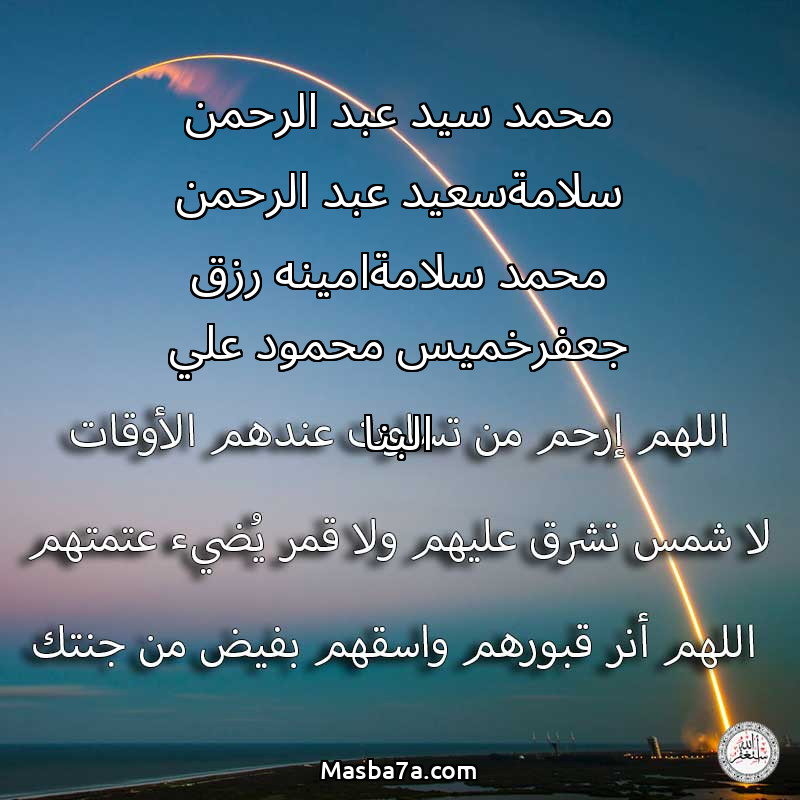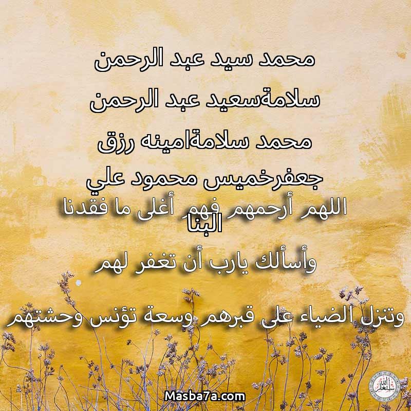 اللهم ارحم ( محمد سيد عبد الرحمن سلامةسعيد عبد الرحمن محمد سلامةامينه رزق جعفرخميس محمود علي البنا ) وانس وحشتهم واجمعنا بهم في جنتك ، اللهم ارحمهم بقدر شوقنا لهم اللهم ارحمهم واغفر لهم.