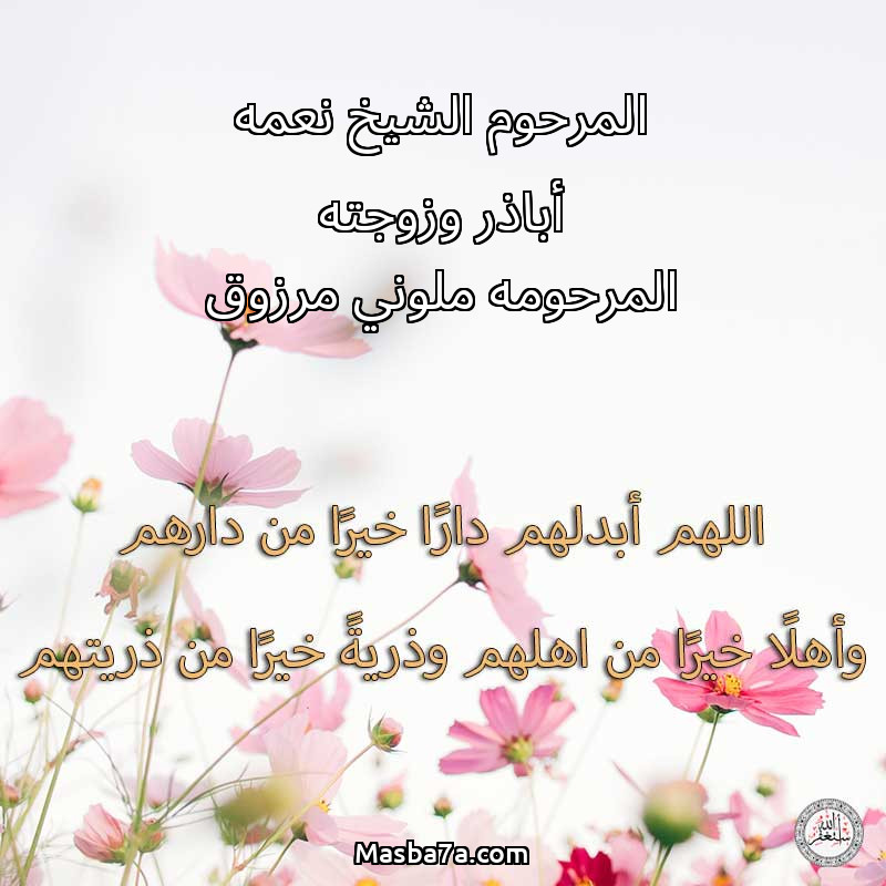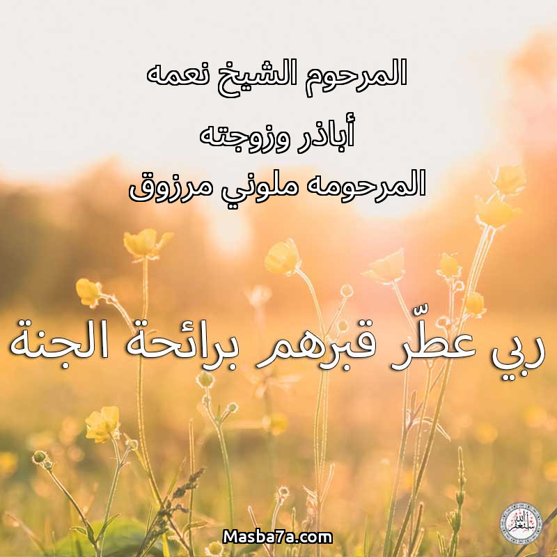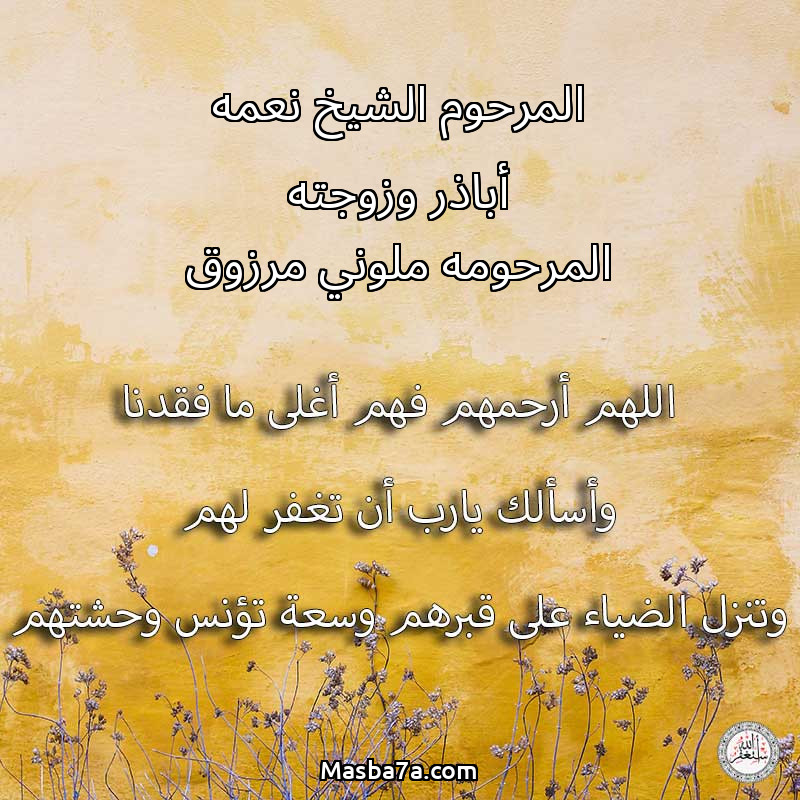 اللهم ارحم ( المرحوم الشيخ نعمه أباذر وزوجته المرحومه ملوني مرزوق ) وانس وحشتهم واجمعنا بهم في جنتك ، اللهم ارحمهم بقدر شوقنا لهم اللهم ارحمهم واغفر لهم.