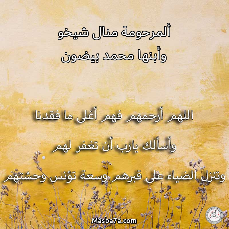 اللهم ارحم ( ألمرحومة منال شيخو وأبنها محمد بيضون ) وانس وحشتهم واجمعنا بهم في جنتك ، اللهم ارحمهم بقدر شوقنا لهم اللهم ارحمهم واغفر لهم.