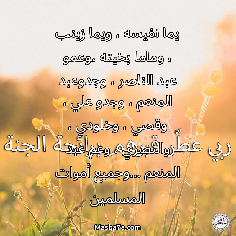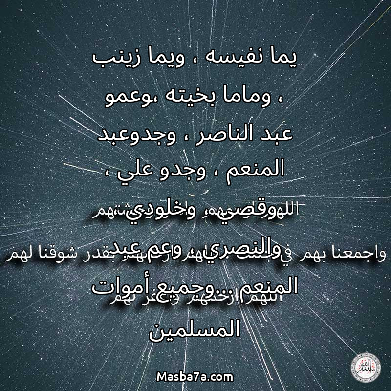 دعاء عن أرواح المرحومين يما نفيسه ، ويما زينب ، وماما بخيته ،وعمو عبد الناصر ، وجدوعبد المنعم ، وجدو علي ، وقصي ، وخلودي ، والنصري ، وعم عبد المنعم ...وجميع أموات المسلمين