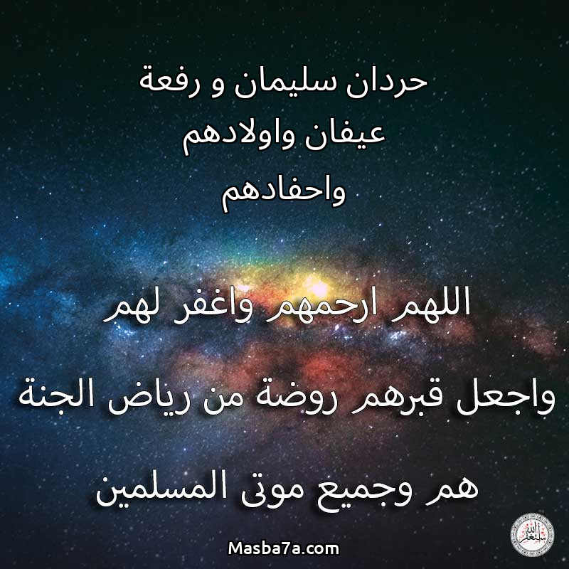 اللهم ارحم ( حردان سليمان و رفعة عيفان واولادهم واحفادهم ) وانس وحشتهم واجمعنا بهم في جنتك ، اللهم ارحمهم بقدر شوقنا لهم اللهم ارحمهم واغفر لهم.