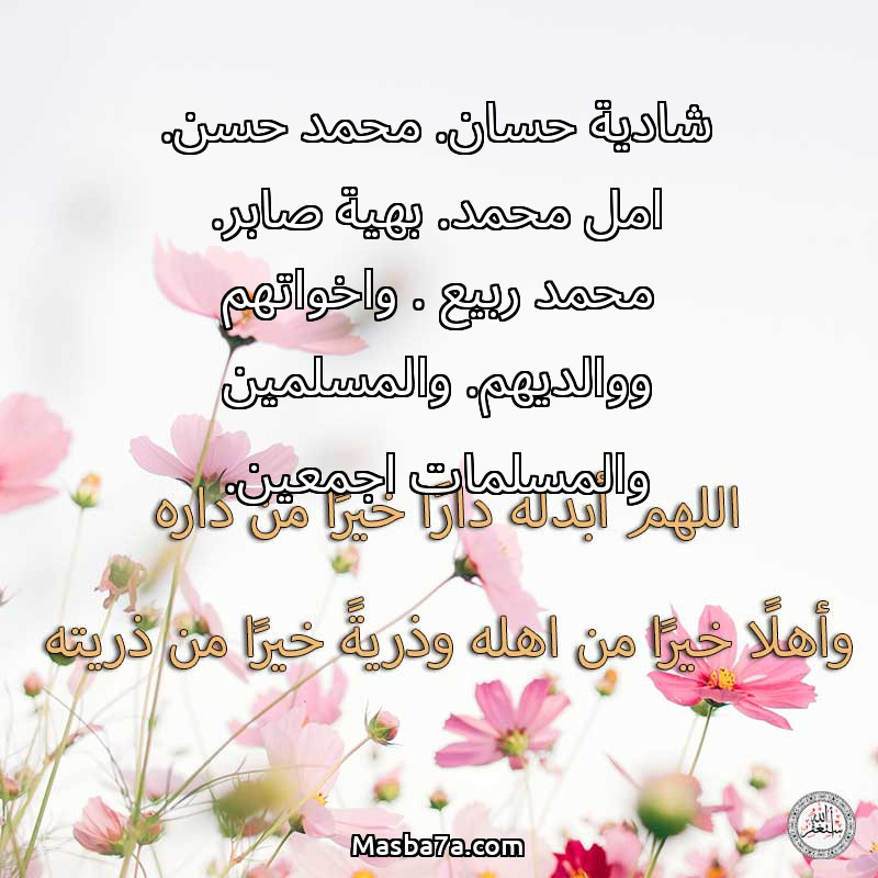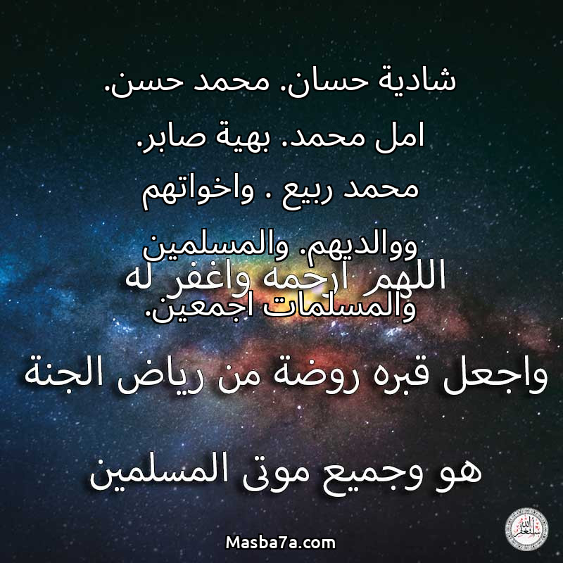 دعاء عن روح المرحوم شادية حسان. محمد حسن. امل محمد. بهية صابر. محمد ربيع . واخواتهم ووالديهم. والمسلمين والمسلمات اجمعين.