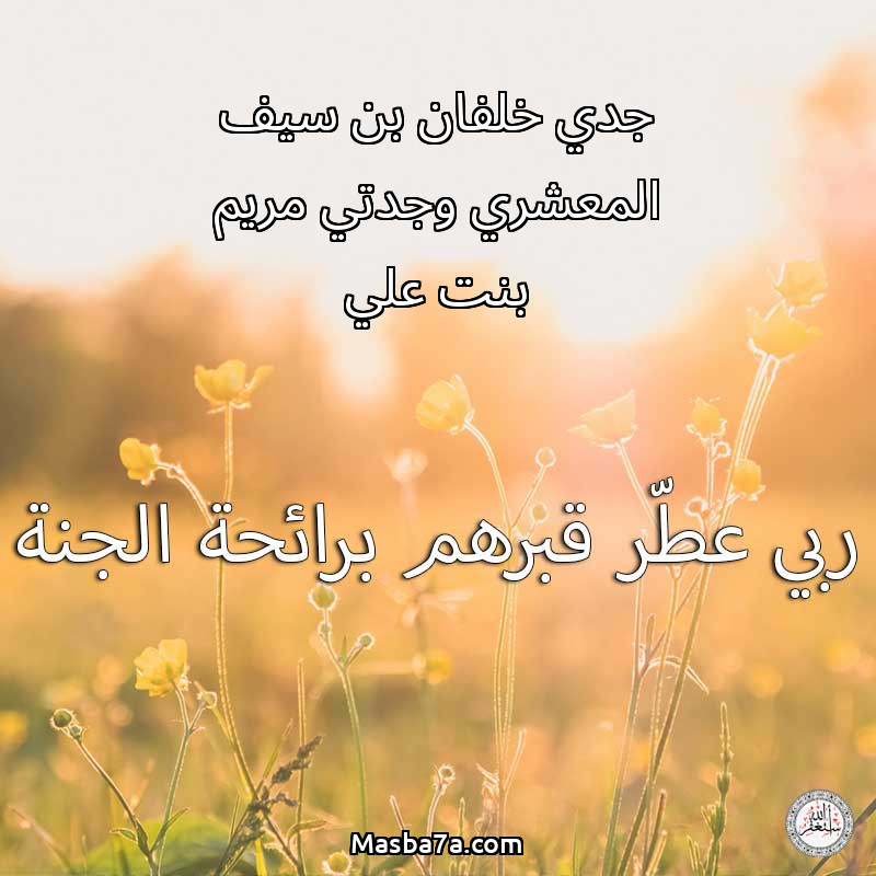 اللهم ارحم ( جدي خلفان بن سيف المعشري وجدتي مريم بنت علي ) وانس وحشتهم واجمعنا بهم في جنتك ، اللهم ارحمهم بقدر شوقنا لهم اللهم ارحمهم واغفر لهم.