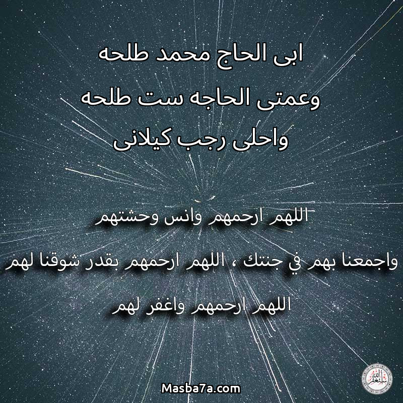 اللهم ارحم ( ابى الحاج محمد طلحه وعمتى الحاجه ست طلحه واحلى رجب كيلانى ) وانس وحشتهم واجمعنا بهم في جنتك ، اللهم ارحمهم بقدر شوقنا لهم اللهم ارحمهم واغفر لهم.
