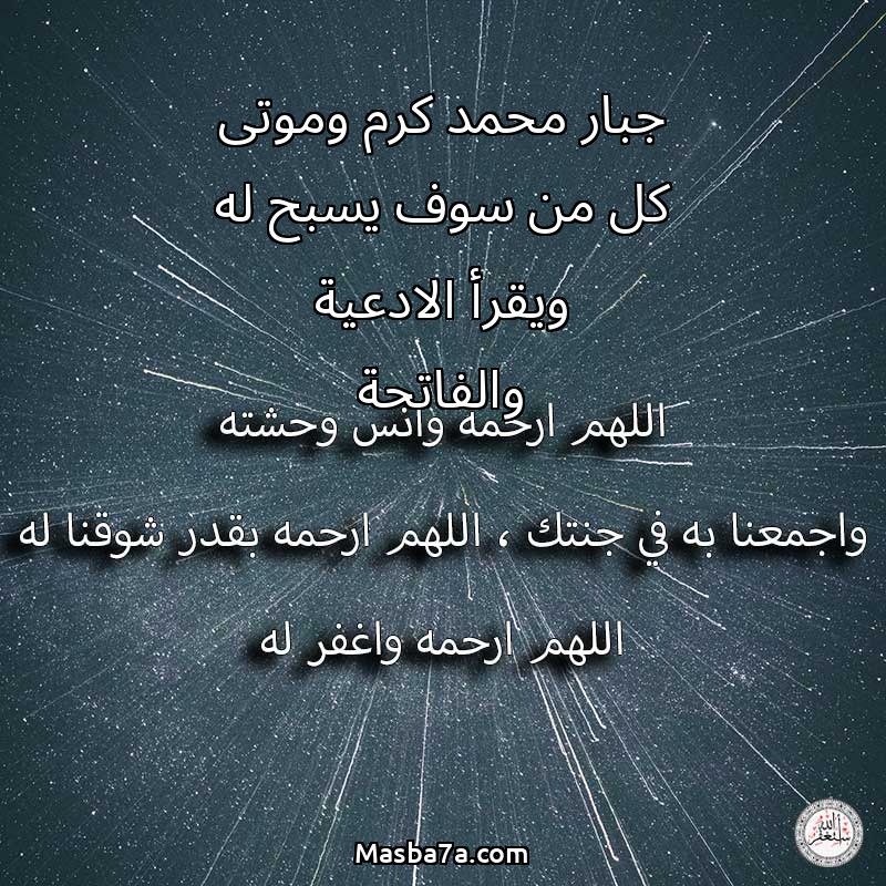 اللهم ارحم ( جبار محمد كرم وموتى كل من سوف يسبح له ويقرأ الادعية والفاتحة ) وانس وحشته واجمعنا به في جنتك ، اللهم ارحمه بقدر شوقنا له اللهم ارحمه واغفر له .