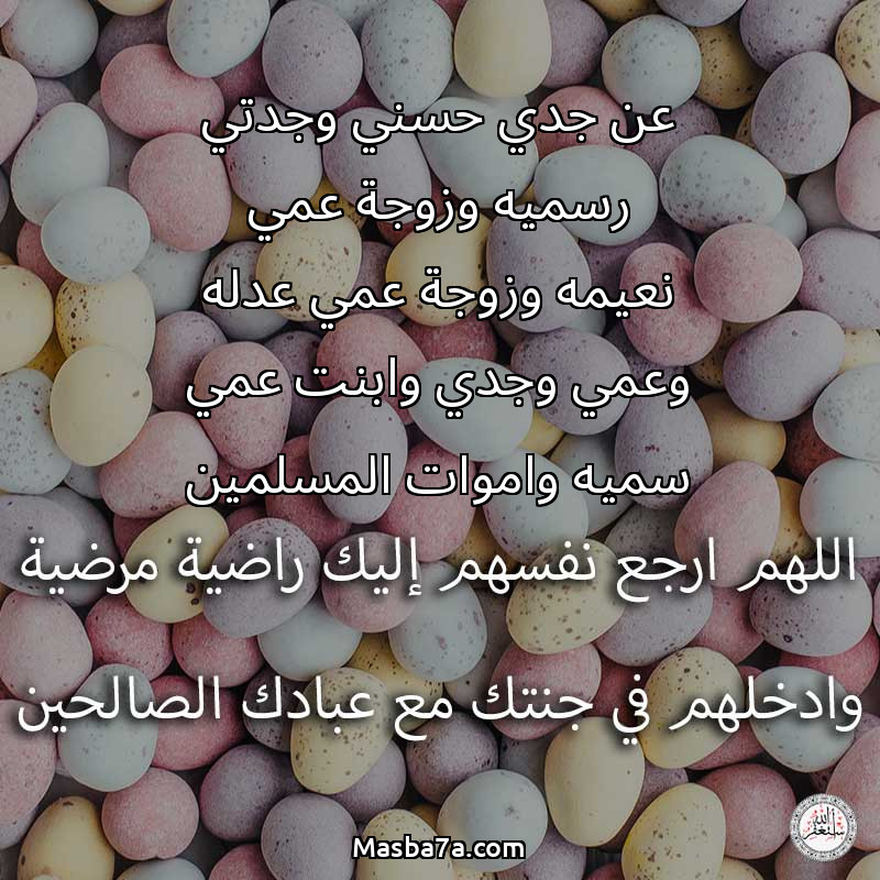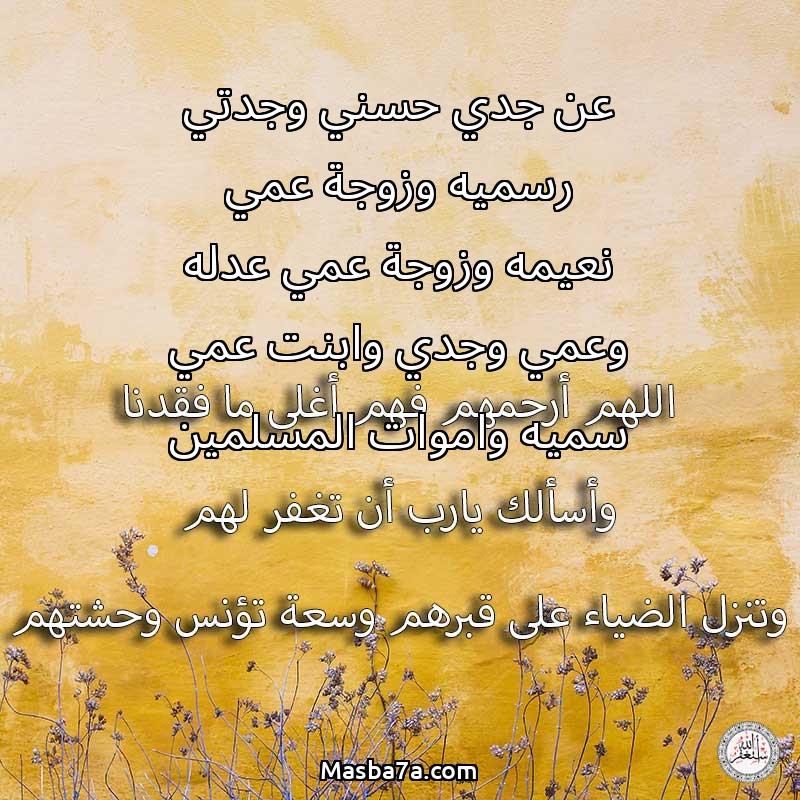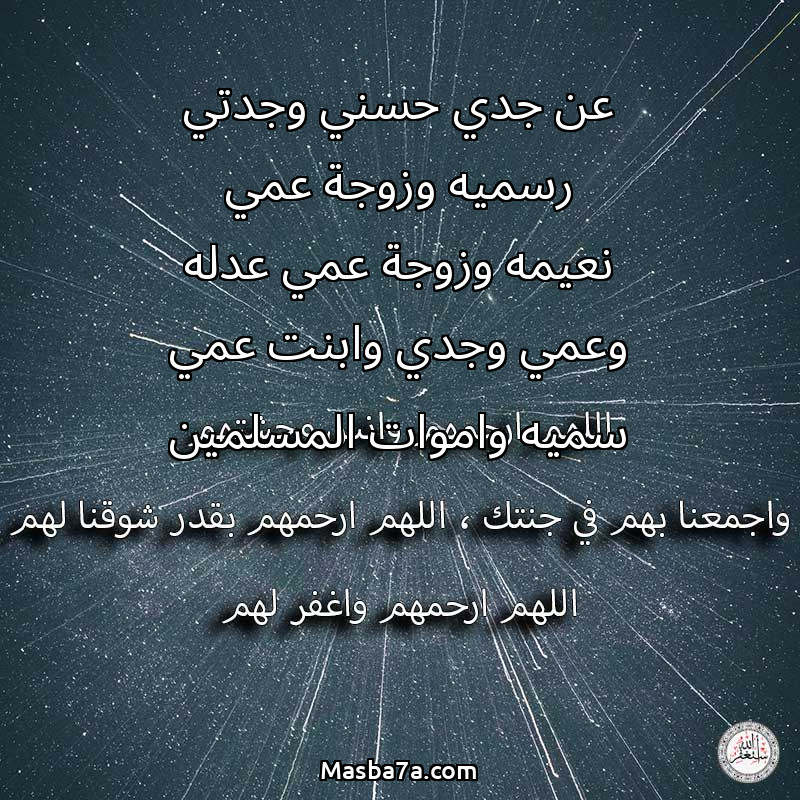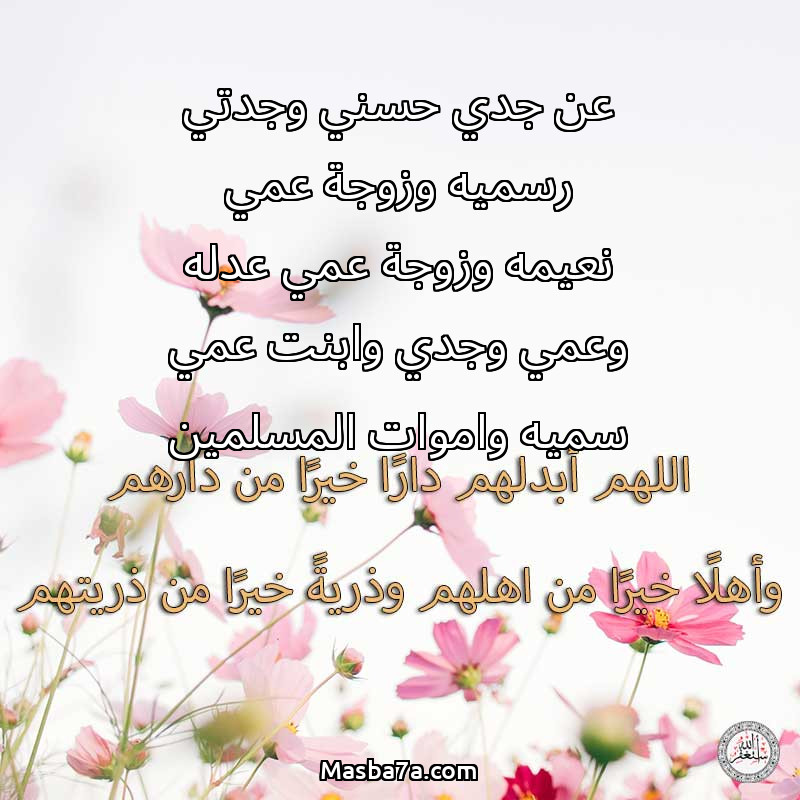 دعاء عن أرواح المرحومين عن جدي حسني وجدتي رسميه وزوجة عمي نعيمه وزوجة عمي عدله وعمي وجدي وابنت عمي سميه واموات المسلمين