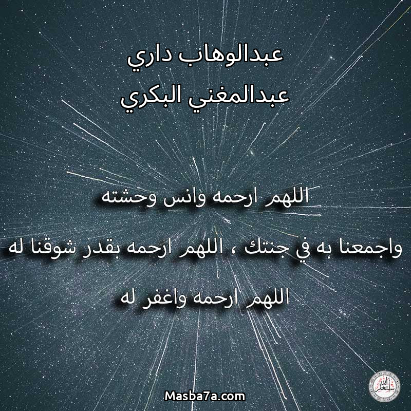 اللهم ارحم ( عبدالوهاب داري عبدالمغني البكري ) وانس وحشته واجمعنا به في جنتك ، اللهم ارحمه بقدر شوقنا له اللهم ارحمه واغفر له .