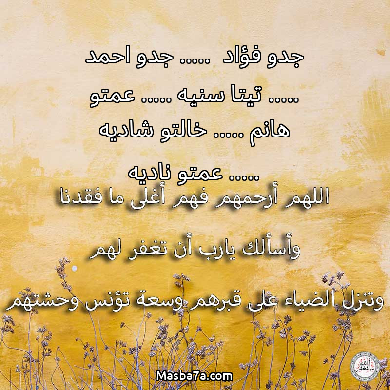 اللهم ارحم ( جدو فؤاد ..... جدو احمد ..... تيتا سنيه ..... عمتو هانم ..... خالتو شاديه ..... عمتو ناديه ) وانس وحشتهم واجمعنا بهم في جنتك ، اللهم ارحمهم بقدر شوقنا لهم اللهم ارحمهم واغفر لهم.