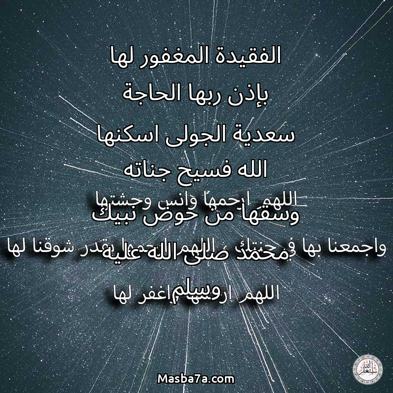 اللهم ارحم ( الفقيدة المغفور لها بإذن ربها الحاجة سعدية الجولى اسكنها الله فسيح جناته وسقها من حوض نبيك محمد صلى الله عليه وسلم ) وانس وحشتها واجمعنا بها في جنتك ، اللهم ارحمها بقدر شوقنا لها اللهم ارحمها واغفر لها .