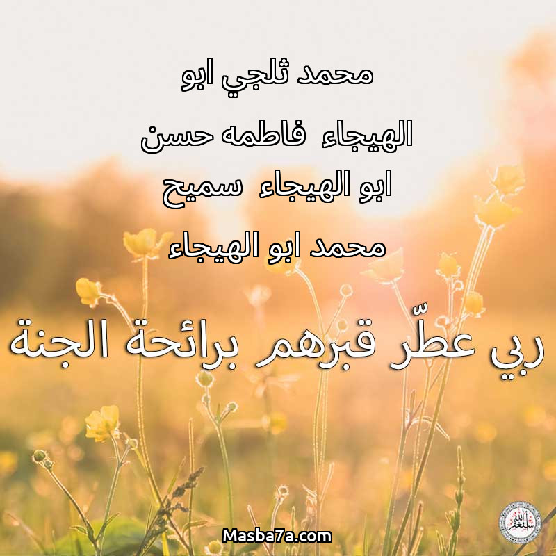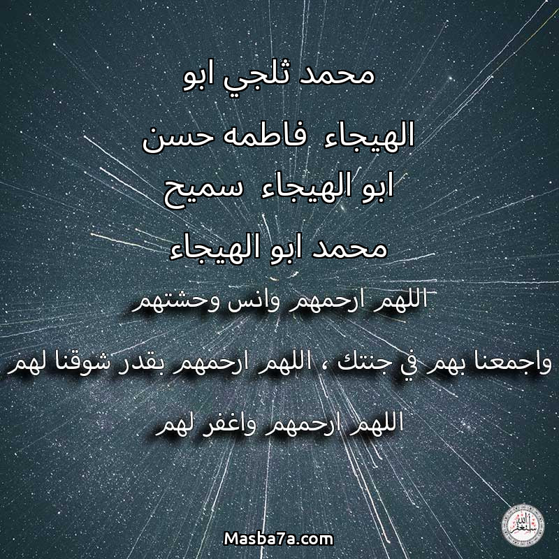 اللهم ارحم ( محمد ثلجي ابو الهيجاء فاطمه حسن ابو الهيجاء سميح محمد ابو الهيجاء ) وانس وحشتهم واجمعنا بهم في جنتك ، اللهم ارحمهم بقدر شوقنا لهم اللهم ارحمهم واغفر لهم.