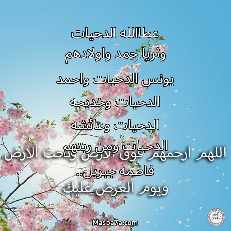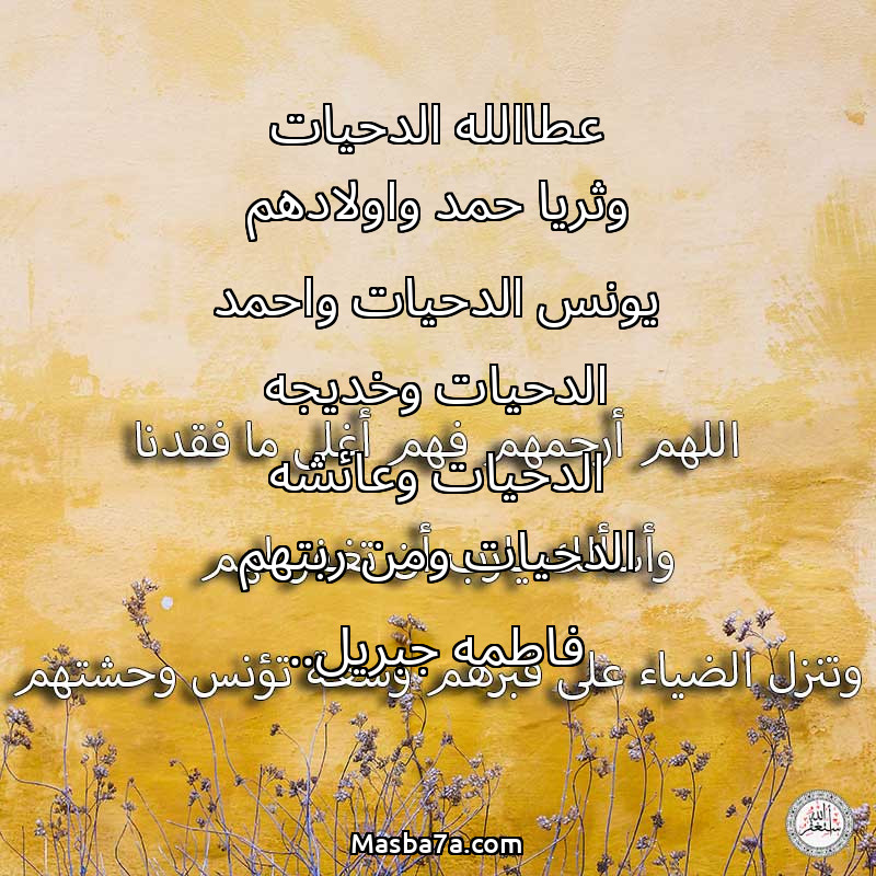 دعاء عن أرواح المرحومين عطاالله الدحيات وثريا حمد واولادهم يونس الدحيات واحمد الدحيات وخديجه الدحيات وعائشه الدحيات ومن ربتهم فاطمه جبريل..